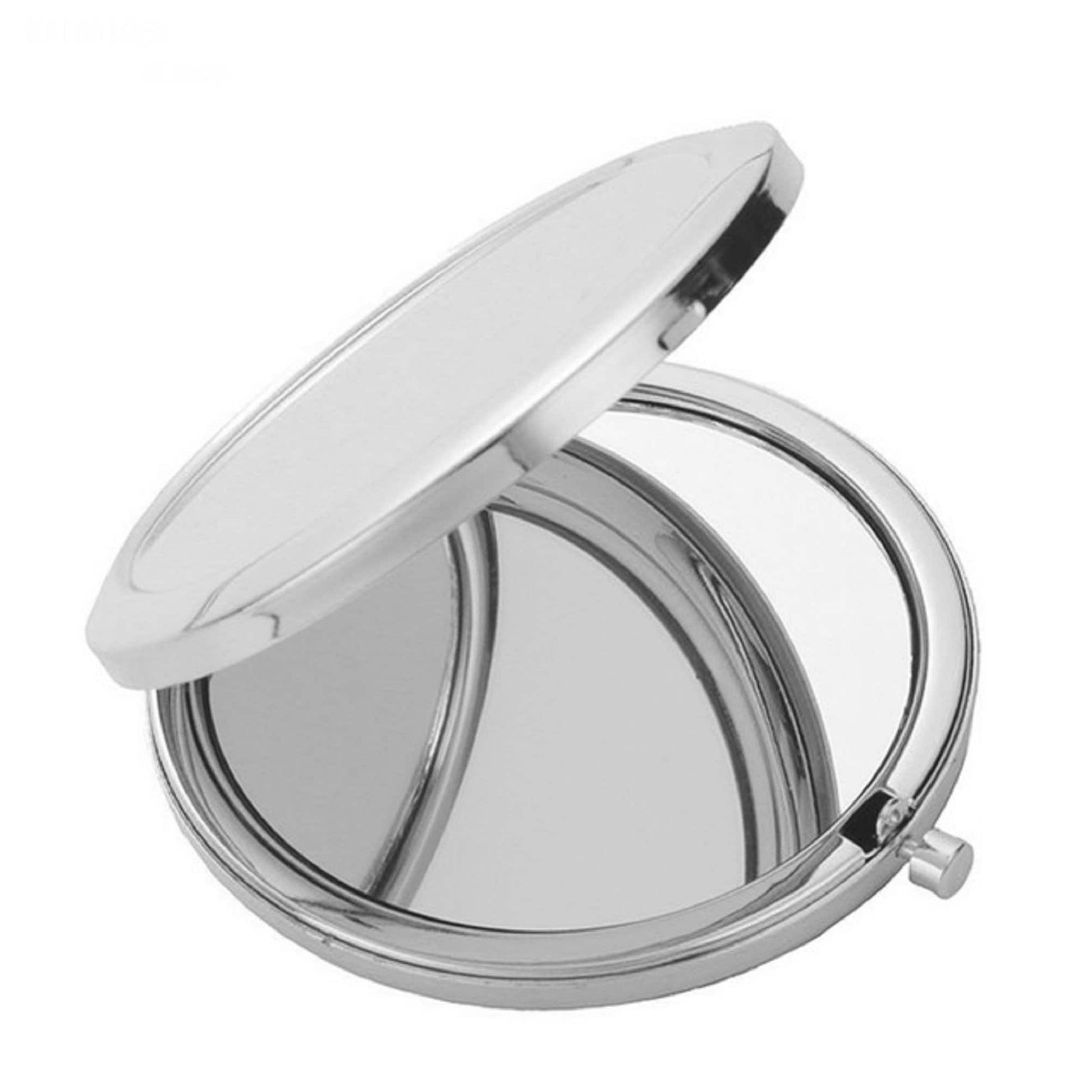 These beautiful compact mirrors have 2 mirrors inside, and button release opening, the top has one of our unique designs, and the mirror is made of metal. it a nice size and has a chunky solid feel.
